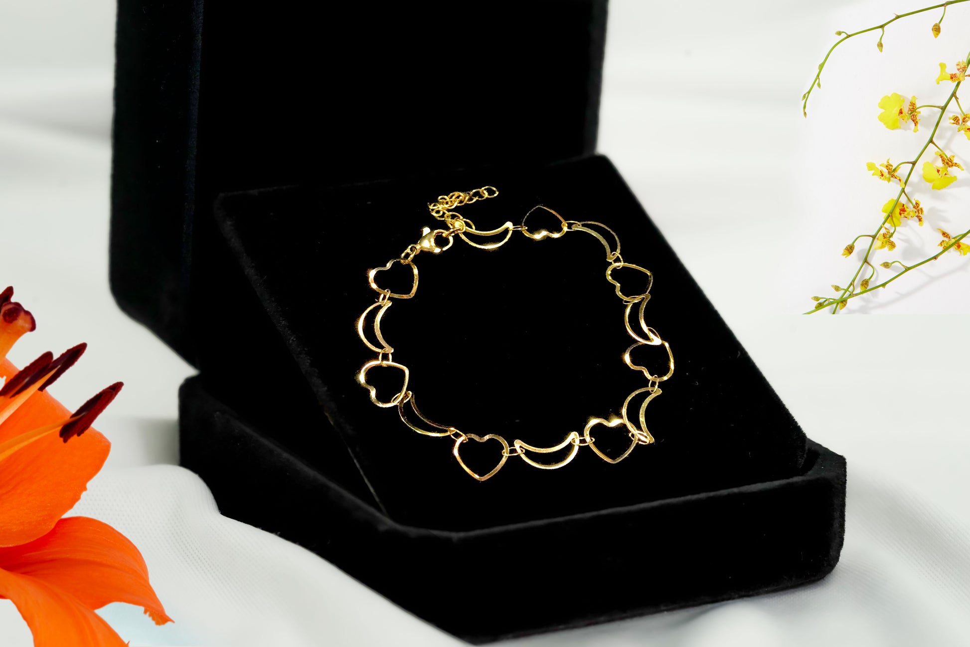 Gaze upon the delicate moon and heart design, intertwined in a dance of love and dreams. Each intricately crafted detail symbolizes the eternal bond between two souls, reflecting the beauty of the night sky and the depth of the human heart. Wear this bracelet as a reminder of cherished moments and the dreams that guide your path. Let it serve as a beacon of hope and inspiration, filling your days with love and light.