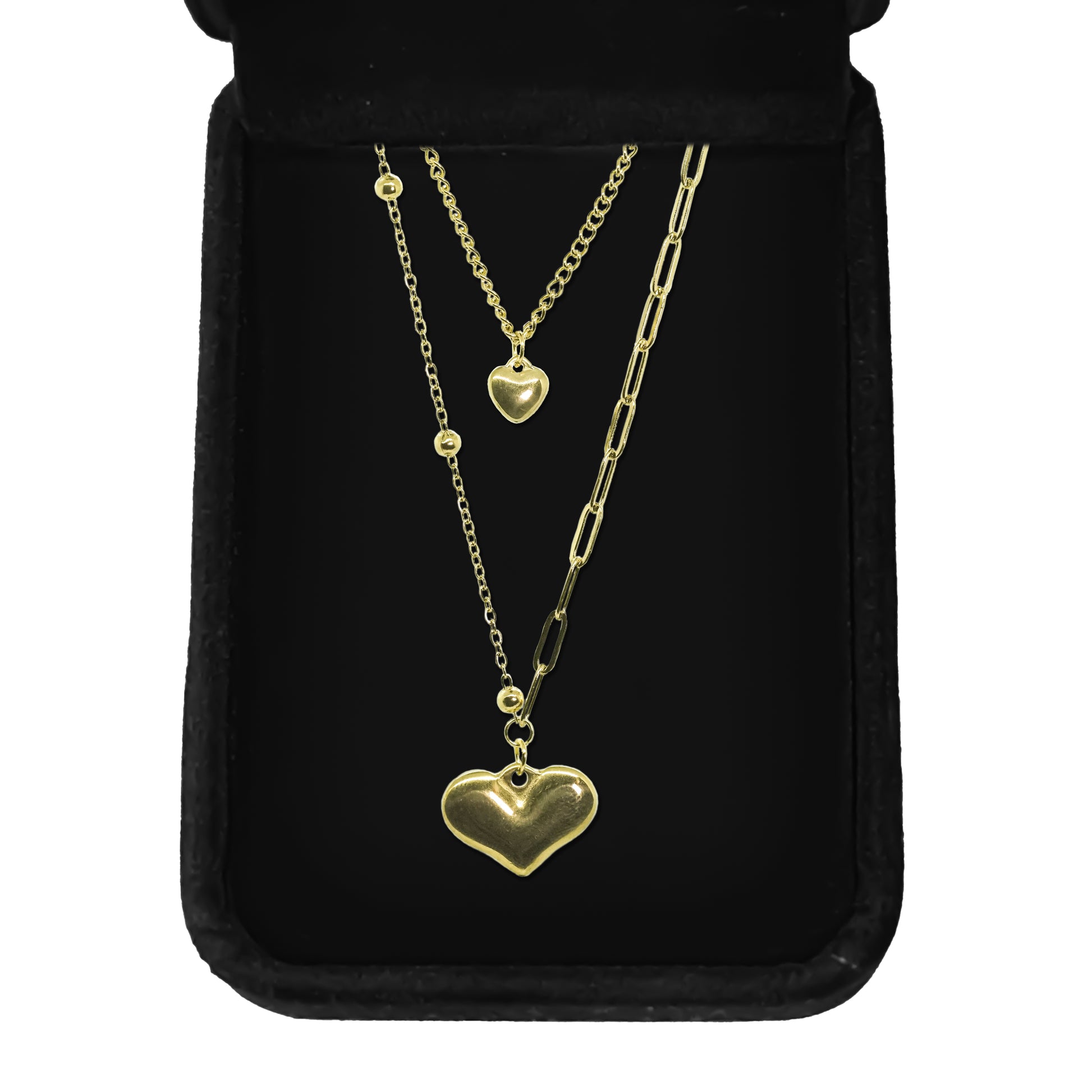 Make a bold fashion statement with our two-layer chain necklace. The larger heart symbolizes love and affection, while the smaller heart adds an element of delicacy and charm. Together, they create a beautiful representation of unity and connection. Whether worn as a bold fashion statement or a subtle expression of love, our Double Chain Heart Necklace is sure to turn heads and capture hearts wherever you go.