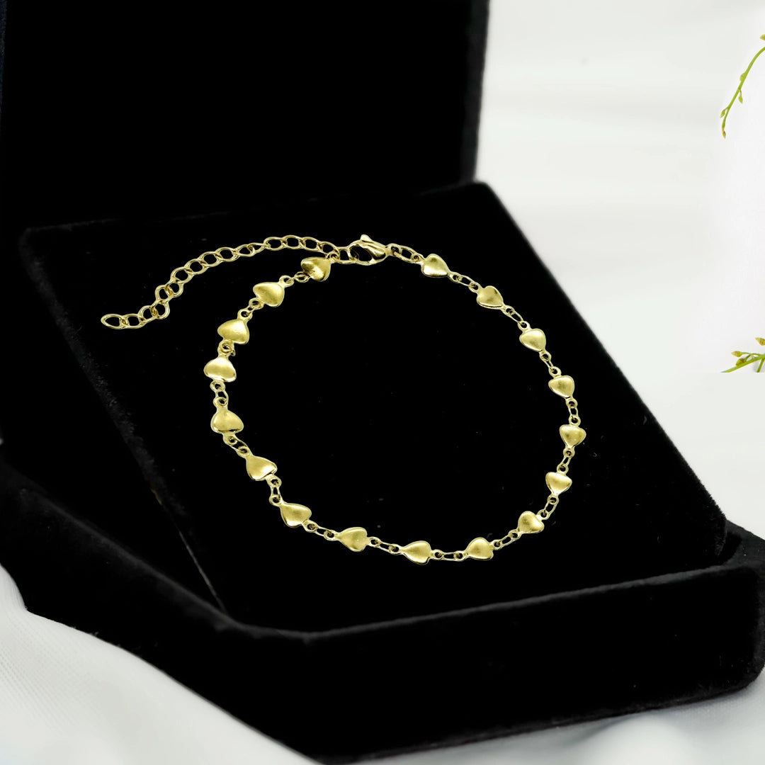 Composed of small heart charms that are linked together, forming a stunning chain that transcends the ordinary gold chain. Whether worn alone for a subtle yet striking statement or layered with other bracelets for a personalized touch, it effortlessly complements any style with its understated elegance.