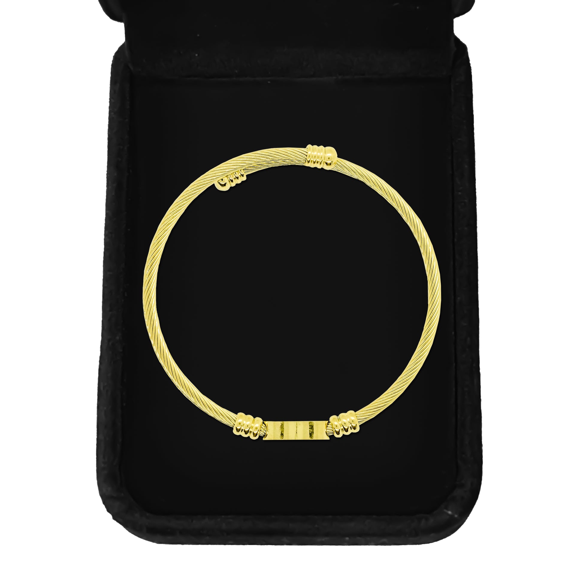 A bold statement piece drenched in radiant gold, This bangle boasts a luxurious thickness that demands attention and admiration. You can wear it alone as a statement piece or paired with other favorites.